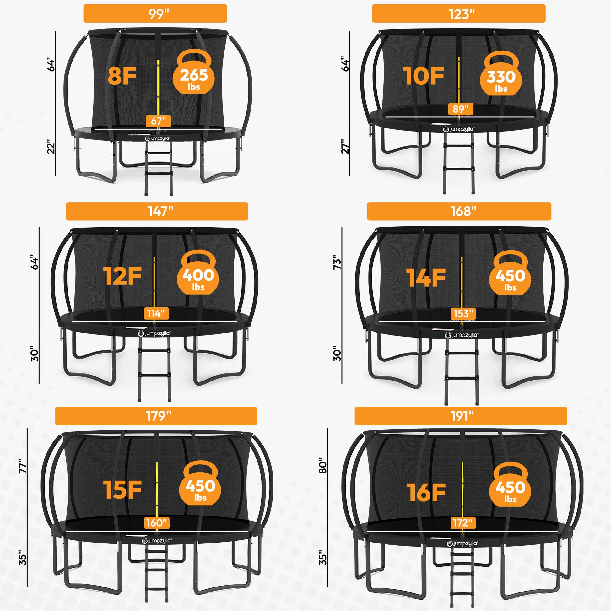 Our 8FT and 10FT models are ideal for younger children, while 12FT-16FT models accommodate teens and adults up to 375 lbs.