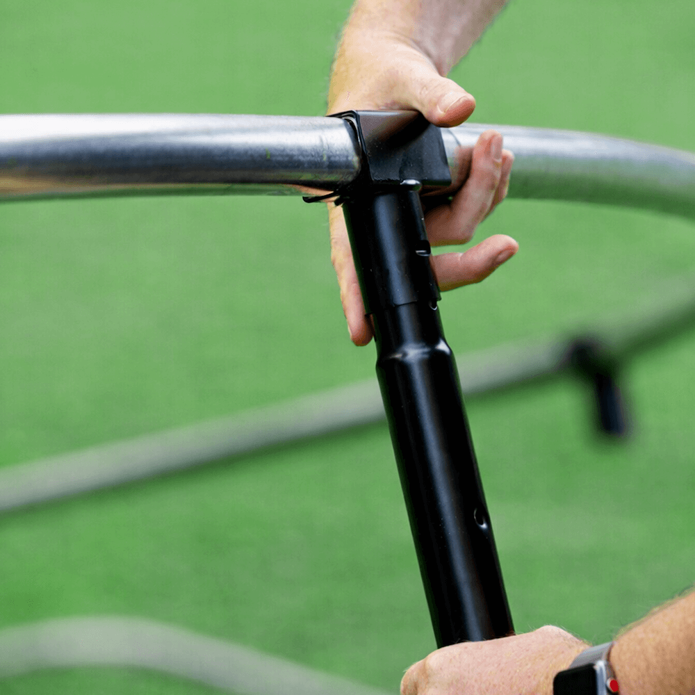 Connect and secure the curved safety poles, then attach the enclosure net.